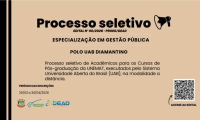 A Universidade do Estado de Mato Grosso (UNEMAT), por meio da Universidade Aberta do Brasil (UAB) Polo de Diamantino, está com inscrições abertas para o processo...